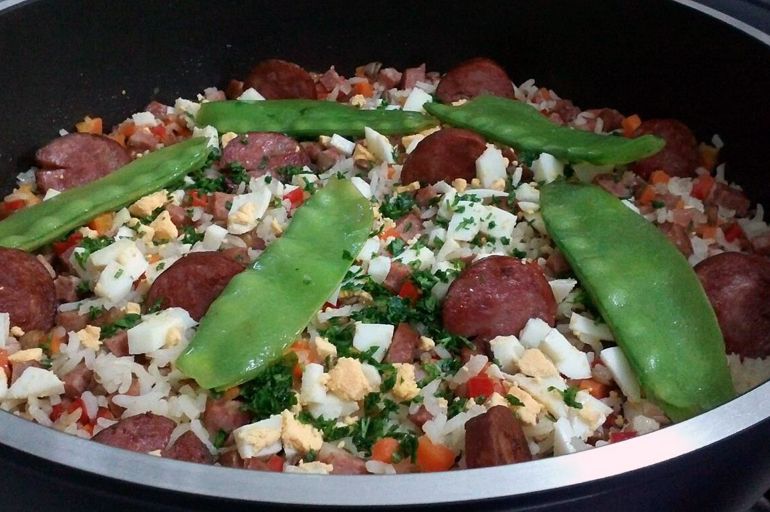 Arroz com lentilha, cenoura, linguiça calabresa, ervilha torta, ovos cozidos e pimentão