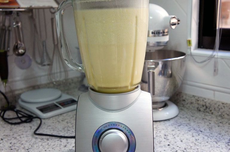 Bata os ovos no liquidificador até que espumem e fiquem com uma coloração mais clara. Adicione os outros ingredientes, misturando-os aos poucos, até a mistura ficar bem homogênea. Levar para assar numa assadeira untada e polvilhada com açúcar, até o que o bolo esteja dourado.