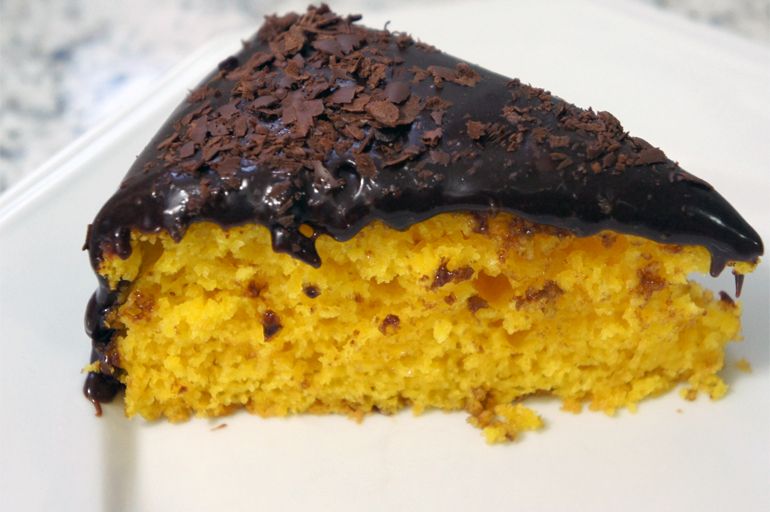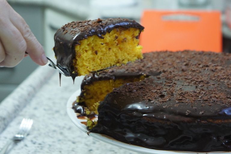 Bolo de cenoura, batido no liquidificador e coberto com um creme feito com Nutella e creme de leite.