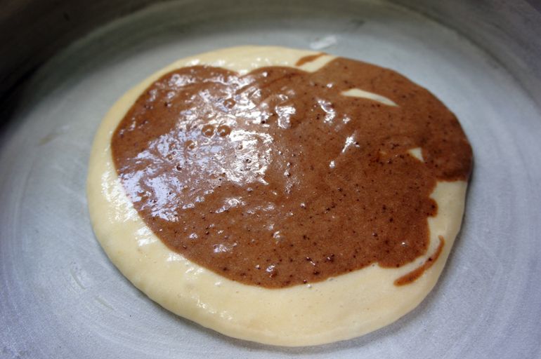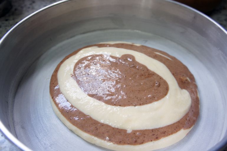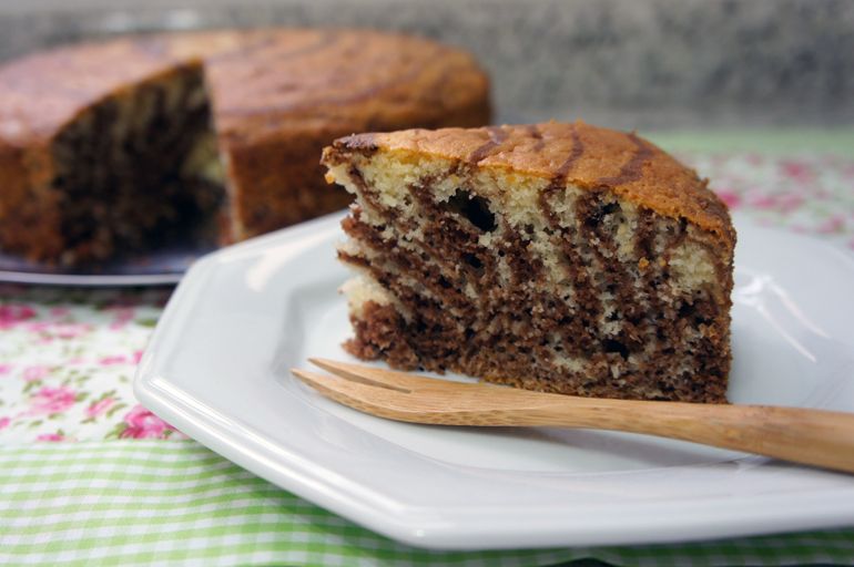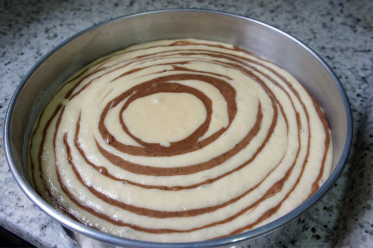 Bolo zebrado com massas de baunilha e de chocolate,