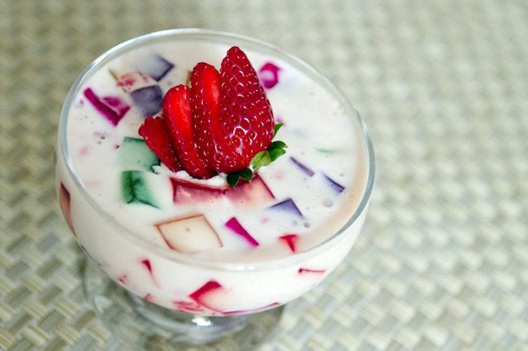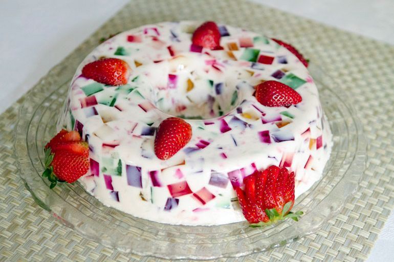 Gelatina enformada, feita com quadradinhos coloridos, envolvidos por um delicioso creme