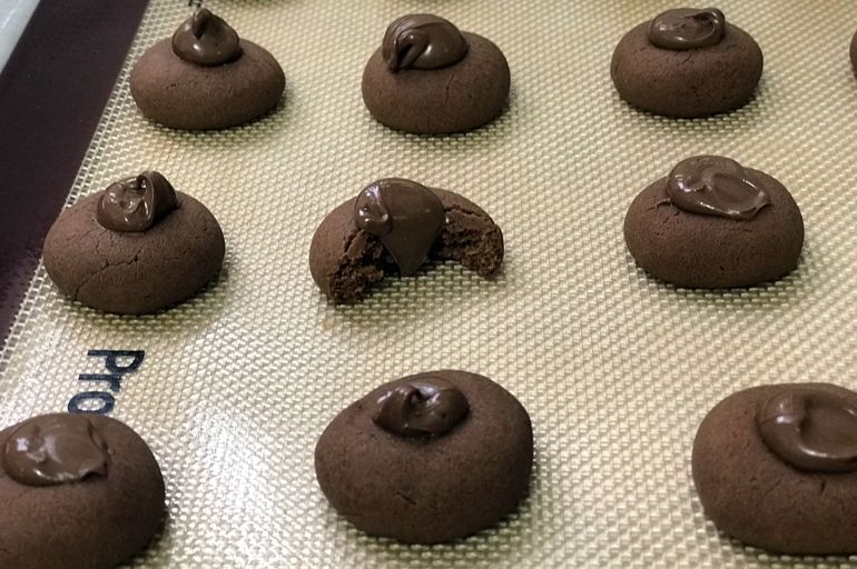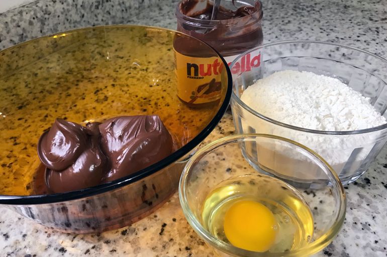 Em uma tigela coloque a Nutella e acrescente o ovo. Com o auxilio de um garfo, mexa até o ovo ficar bem incorporado. Vá colocando a farinha de trigo aos poucos e mexendo sempre com o garfo até formar um massa homogênea. No final ela ficará um pouco pesada, mas mexa bem com o garfo que logo ela irá dar ponto. Faça bolinhas e coloque em assadeira untada e enfarinhada. Se você tiver o tapete de silicone, facilitará muito o seu trabalho e não precisará untar a forma. Com o auxílio de um cabo redondo de colher de pau, faça covinhas nas bolachas achatando-as. Caso não tenha um utensílio redondo, use o seu dedo mesmo. Leve para assar em forno moderado por mais ou menos de 15 a 20 minutos. Tire do forno e espere esfriar. Coloque um pouco de Nutella (mais ou menos 2 colheres de sopa) num saco de confeitar e preencha as cavidades das bolachinhas. Faça um café bem gostoso e divirta-se.