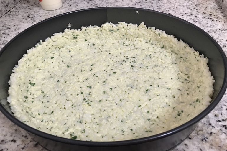 Em uma tigela, coloque o arroz, o ovo, o queijo parmesão ralado, o requeijão e a salsa picadinha. Mexa bem, verifique o sal e misture até formar uma massa. Forre o fundo e a lateral de uma forma redonda (25 cm de diâmetro), de preferência com aro removível, com essa massa de arroz e reserve.