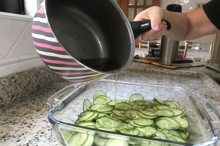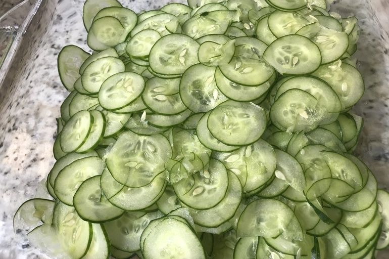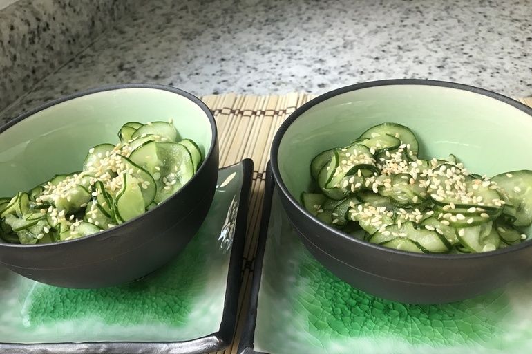 Salada de pepino japonês, fatiado bem fino e temperada com molho agridoce