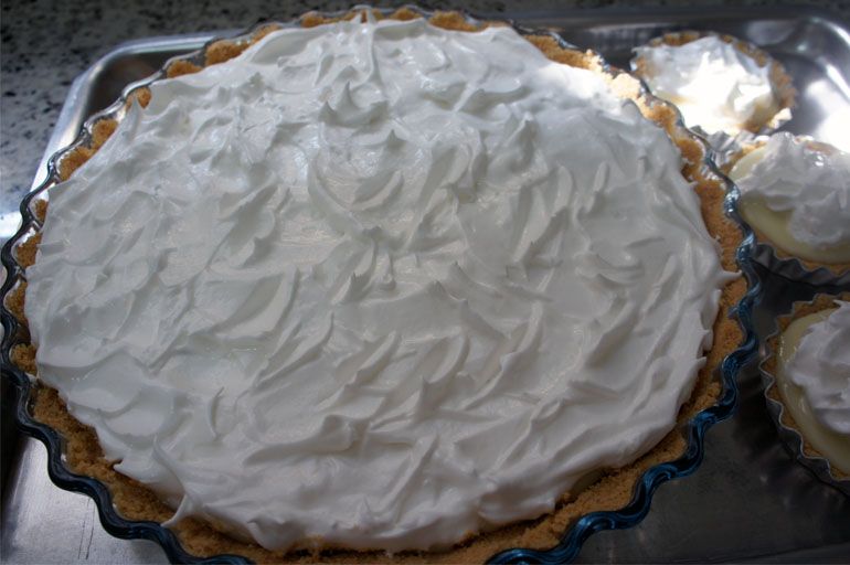 Bata as claras em neve e coloque o açucar e as gotas de limão. Bata mais um pouco até formar um suspiro. Espalhe sobre o recheio, com o auxílio de duas colheres, fazendo picos. Leve ao forno até dourar. Retire, deixe esfriar e enfeite com raspas de limão. Leve à geladeira antes de servir.